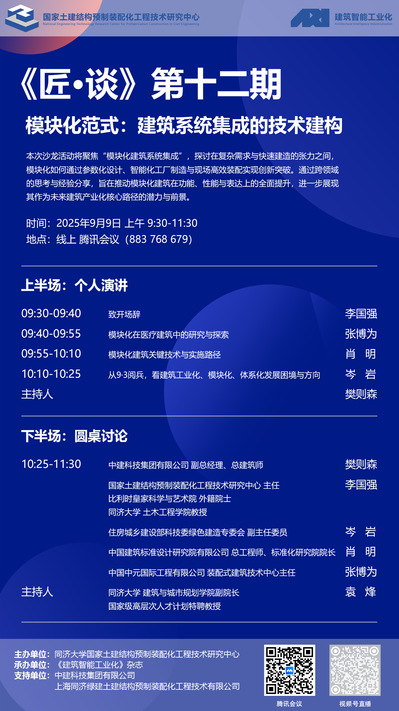 2025年9月9日上午9:30,由国家土建结构预制装配化工程技术研究中心(后简称“国家中心”)主办,《建筑智能工业化》杂志承办的《匠·谈》第十二期活动圆满举办。《匠·谈》是国家中心策划的系列活动,计划结合每一时期与建筑工业化、信息化、智能化相关的国家宏观政策与规划,以直播讲座、沙龙、对谈等形式呈现。讲座以个人演讲形式为主,进行专业领域深度分享;沙龙以圆桌讨论形式,进行多人交流思想交锋;对谈以双人对话形式,进行头脑风暴。